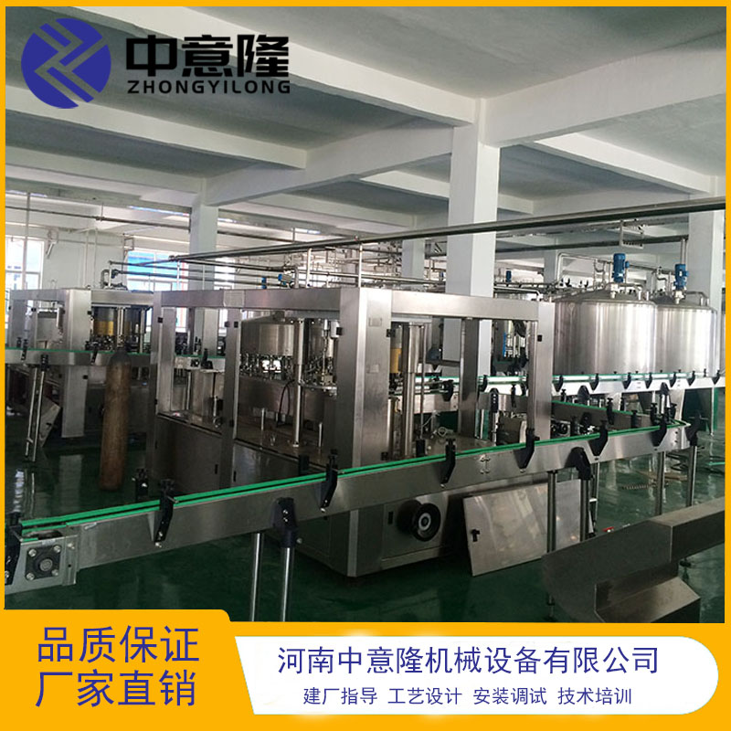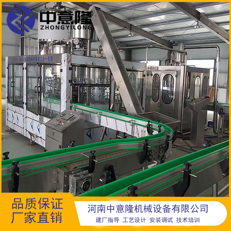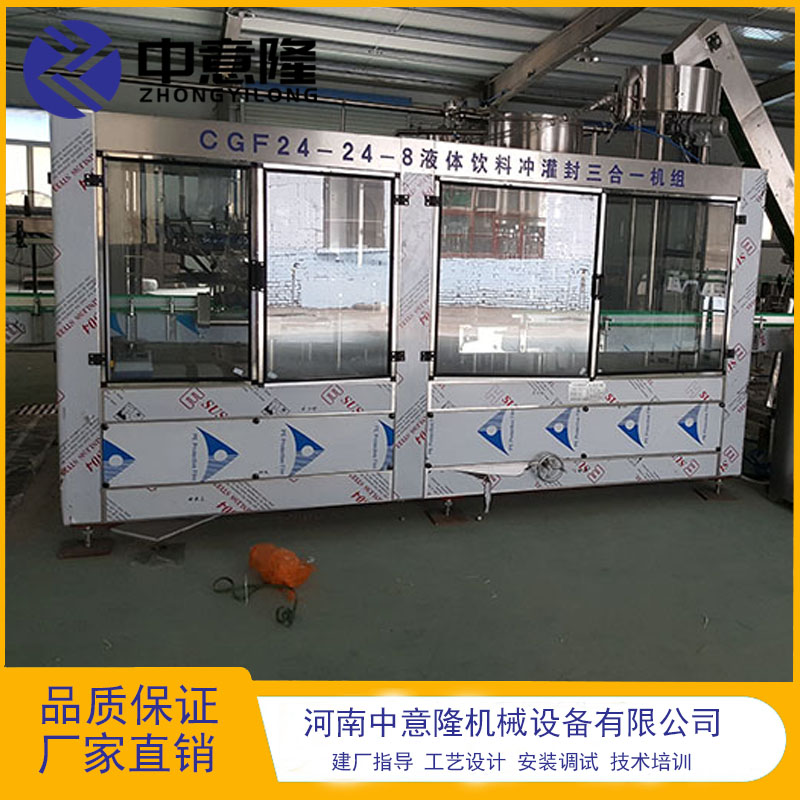 苹果饮料加工设施饮料罐装生产线将冲洗、灌装、封盖三功能组合在一个机体上,全过程实现自动化,适用于耐高温聚脂瓶灌装果汁饮料、果茶饮料,也适用于矿泉水、纯净水等不含气饮料,果汁饮料生产线材料制作,饮料罐装生产线主关件部件采用数字控制机床精密加工, 整机使用先进光电检测各部件的运作状况,具有无瓶不灌装,无瓶不送盖,自动化程度高,简易的人机界面的操作显示屏。